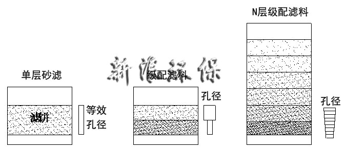 為了提高過濾效率,采用雙層或多層濾料,在確保過濾精度的前提下,可以提高速度及納污量。